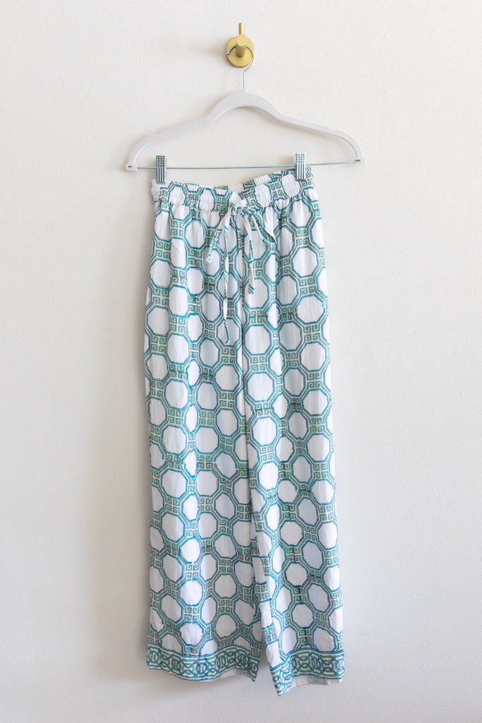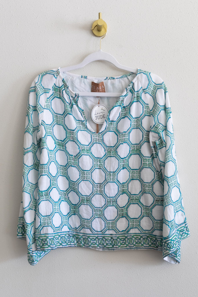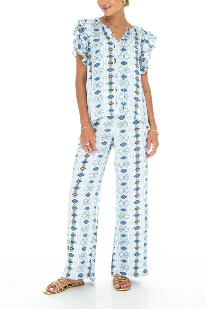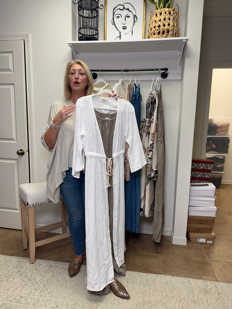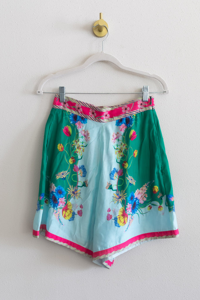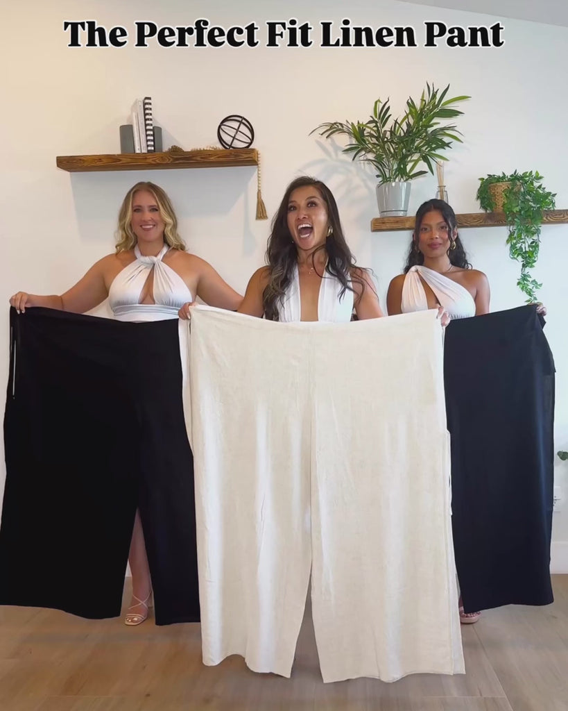 Two women in elegant outfits standing in front of a decorative gate with greenery.