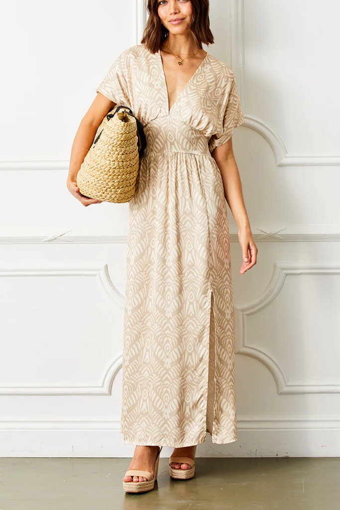 ntroducing the Ginger Satin Print Empire Line Maxi Dress – a sophisticated blend of effortless style and practicality. With its stunning printed design and neutral colour palette, this dress is a must-have for any summer wardrobe. The low V-neck and batwing sleeves create a sophisticated and airy silhouette that's perfect for warmer weather.