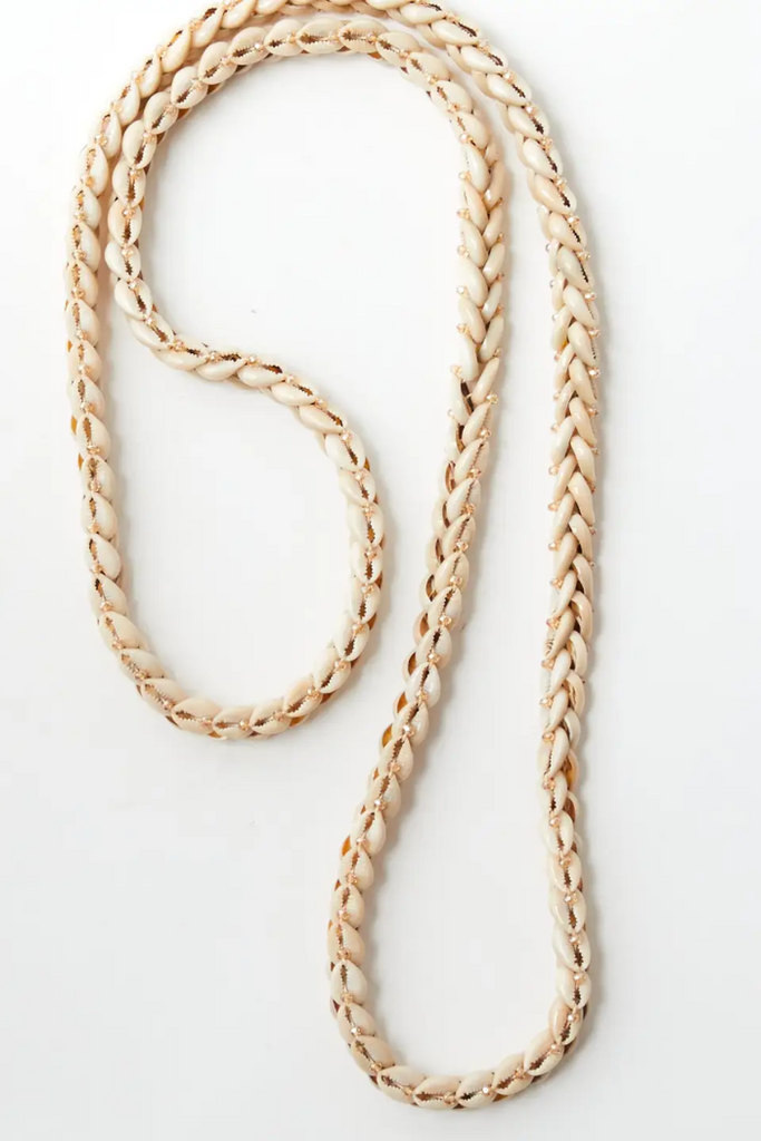 Matilda is one of our best selling necklaces. It features Cowry Shells stitched together between tiny beige crystals. It looks great worn long, or doubled over.